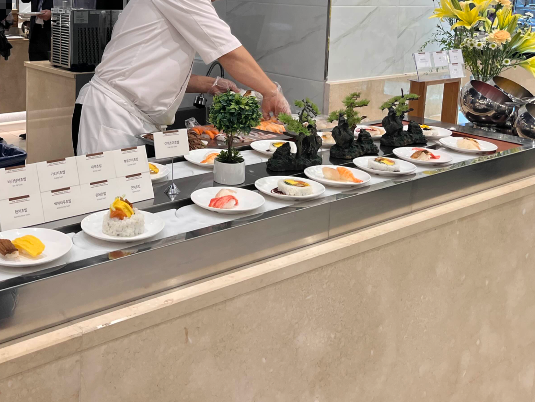 식사 공간은 약 400석 규모의 테이블과 의자가 있어서 여유로운 식사가 가능하고, 130가지 다양한 음식이 있다고 해서 하객분들의 만족도 높을 것 같았습니다.