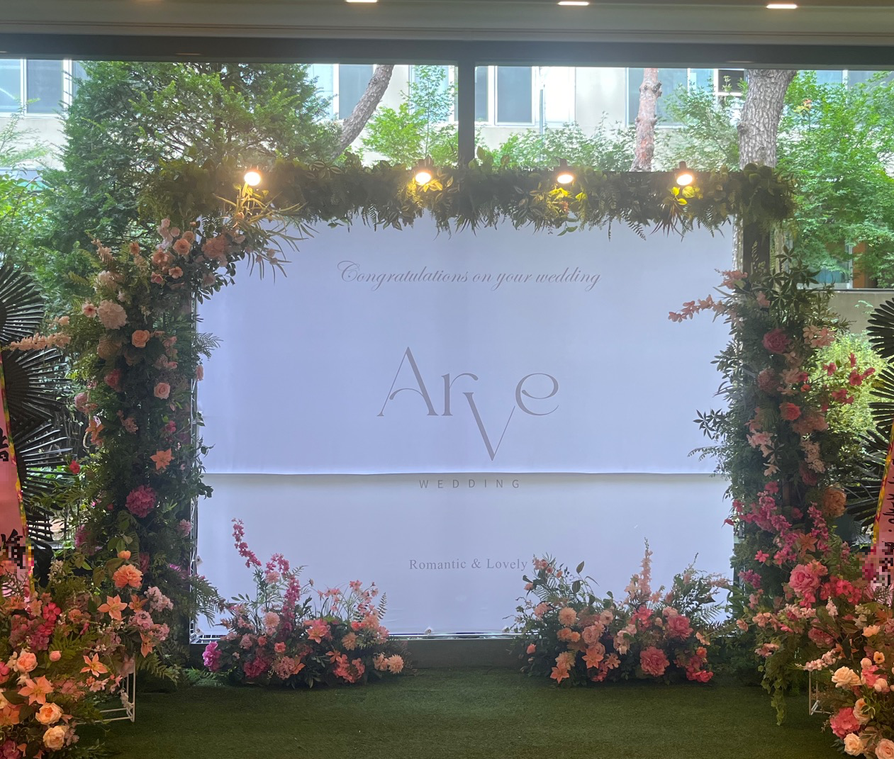 웨딩홀 앞에는 포토테이블과 포토존이 있었어요. 웨딩사진과 꽃장식이 조화롭게 세팅되어 있었습니다.